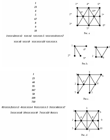 3. Повторить эту процедуру последовательно для каждой из вершин первого уровня - это значит сперва для вершины 2, затем - 3 и т.д. Для исследуемого гграфа еще неперенумерованной вершиной, смежной с вершиной 2 является вершина 3* - она становится вершиной 5. Смежными с вершиной 3 (которая сначала имела номер 4*) являются вершины 6*, 5* и 10*. В соответствии со степенью этим вершинам присваивают номер 6, 7 и 8 (Рис. c). Заметим, что вершины 5, 6, 7 и 8 связаны с вершиной 1 путем двойной длины и относятся ко второму уровню