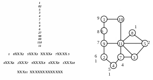Если выбрать в качестве стартовой вершину 8, хотя и имеющую минимальную степень, но не являющуюся периферийной, то получается упорядочение, показанное ниже с профилем, также равным 19. Полуширина станет равной 10.
