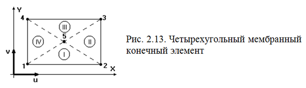 Матрица жесткости четырехугольного мембранного КЭ определяется как сумма матриц жесткостей четырех треугольных КЭ, которые предварительно вычисляют по формуле