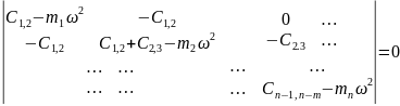Полученная система уравнений является однородной относительно искомых амплитуд Ai. Как известно, отличное от нуля решение эта система имеет лишь в том случае, если определитель системы равняется нулю, т. е.: