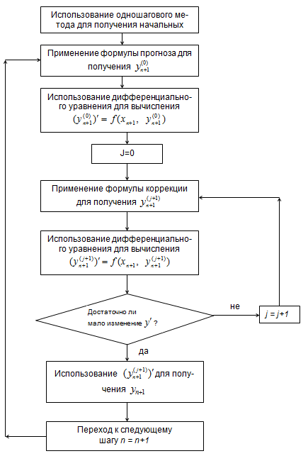 Далее представлена схема алгоритма метода прогноза и коррекции для решения дифференциального уравнения вида y'(x)=f(x, у).