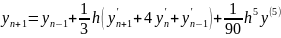 Последние члены в обеих формулах в действительности в итерационном процессе не используются и служат лишь для оценки ошибки усечения. Метод Милна относят к методам четвертого порядка точности, так как в нем отбрасываются члены, содержащие h в пятой и более высоких степенях. Может возникнуть вопрос, зачем вообще нужна коррекция, если прогноз имеет четвертый порядок точности. Ответ на этот вопрос дает оценка относительной величины членов, выражающих погрешность. В данном случае погрешность усечения при коррекции в 28 раз меньше и поэтому представляет большой интерес. Вообще итерационные формулы гораздо более точны, чем формулы прогноза, и поэтому их использование оправдано, хотя и связано с дополнительными трудностями. Несмотря на то, что формула Милна содержит меньший числовой коэффициент (1/90) перед отбрасываемым членом, ее используют реже, чем другие (с большими отбрасываемыми членами), так как ей присуща неустойчивость. Это означает, что погрешность распространения может расти экспоненциально, причем этот вывод справедлив для всех формул коррекции, основанных на правиле Симпсона.