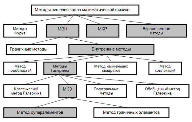 В настоящее время можно выделить три основных подхода к решению задач математической физики. Прежде всего, это широкий спектр математических методов, известных под названием взвешенных невязок (рисунок ниже).
