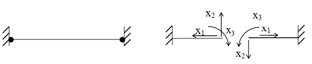 Получим матрицу жесткости балочного конечного элемента. Для этого рассмотрим балку постоянной жесткости, защемлённую по краям и загруженную поперечными и продольными силами и изгибающим моментом. Если мысленно разрезать балку, то в каждом сечении балки имеем три неизвестных фактора: x1 – усилие в направлении оси х,x2– в направлении оси у и x3– изгибающий момент.
