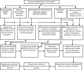 Приведем в качестве примера общую блок-схему расчета конструкций по методу конечных элементов для задач прочности.