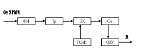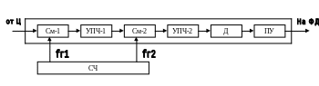 В смесителе См-1 пришедший с циркулятора Ц сигнал, имеющий (без учета доплеровского сдвига частоты) частоту Кп.чf0, преобразуется на первую промежуточную частоту fп.ч1, на которую настроен усилитель УПЧ-1. Для этого на См-1 с синтезатора частот СЧ подается сигнал гетеродина с частотой fг1= Кп.чf0+ fп.ч1. Основная функция УПЧ-1 заключается в подавлении просачивающегося с передающего тракта зондирующего сигнала. Вместе с циркулятором УПЧ-1 должен обеспечивать требуемый коэффициент развязки передающего и приемного трактов. Второй усилитель (УПЧ-2) выполняет обычные для супергетеродинных приемников функции усиления и фильтрации сигналов. Частота гетеродина fг2= fп.ч1+ fп.ч2.