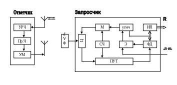 Сигнал запроса в простейшем случае с приемной антенны ответчика А-1 поступает на усилитель радиочастоты УРЧ, а с последнего – на преобразователь частоты Пр.Ч. Ответный сигнал с частотой Кп.чf0 после усиления по мощности в УМ излучается антенной А-2.