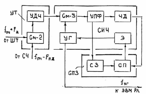 - доплеровский сдвиг частоты ; УУДН – устройство управления диаграммой направленности ; ППП – переключатель прием – передача ; АС/ВТ – антенная система и волноводный тракт ; ФД – фазовый детектор углового дискриминатора; ОДЦ – обнаружитель движущихся целей ; СО – сигнал обнаружения цели ; ЭВМ РЛ – ЭВМ радиолокатора ; ПИ – потребитель информации, выдаваемой радиолокатором ; УДЧ – усилитель доплеровских частот ; См – смеситель ; УПФ – узкополосный фильтр ; ЧД – частотный дискриминатор ; СИЧ – следящий измеритель частоты ; УГ – управляемый генератор ; Э – экстраполятор ; СПЗ – схема поиска и захвата ; СЗ – схема захвата ; СП – схема поиска ;