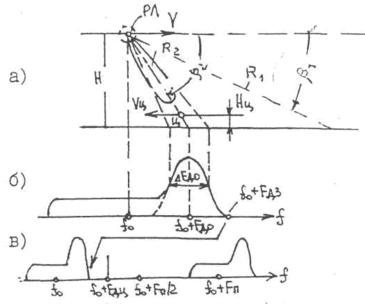 Тактическая ситуация, соответствующая исходным данным на проектирование, предполагает решение частной задачи, когда атака цели производится на встречном курсе и истребитель сближается с целью, находящейся впереди и летящей на ему встречу. Радиолокатор должен рассчитываться на перехват цели в наиболее неблагоприятных условиях, когда истребитель находится выше цели, совершающей маловысотный полет, и РЛ наблюдает ее на фоне земной поверхности. Подобная ситуация показана на рис. 1.2, а. На рис. 1.2,б изображен спектр помехи, создаваемой отражениями от земной поверхности при непрерывном и немодулированном сигнале, а на рис. 1.2.в- спектр такой помехи при импульсном сигнале и положение одной из спектральных составляющих отраженного от цели сигнала в свободной от помех частотной области.