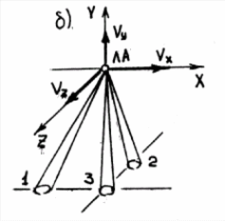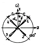 Число и расположение лучей ДHA. Сигналы, необходимые для определения вектора скорости или его составляющих, в ДИС получают от многолучевой антенной системы (АС), состоящей из двух идентичных (передающей и приемной) волноводно-щелевых ФАР, жестко связанных с корпусом ЛА. Применяют четырехлучевые или трехлучевые АС (рис. 3.2). В последнем случае один из показанных на рис. 3.2,а лучей отсутствует. Предпочтение отдают более простым трехлучевым АС. Четырехлучевую АС используют в некоторых типах ДИС, в которых отсутствует стабилизация выходных данных и влияние угловых колебаний ЛА на точность измерения скорости снижают путем совместной обработки сигналов, принятых по двум лучам ДНА ([З], с.353). В вертолетных ДИС находит применение треугольное расположение лучей (рис.3.2,б), при котором основными источниками информации о составляющих скорости Vx, Vz и Vy служат сигналы, принимаемые по лучам 1, 2 и 3 соответственно.
