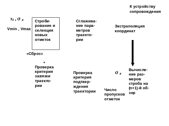 Факт попадания очередной получаемой отметки в строб проверяется путем сравнения разности координат полученной xi и экстраполированной xэi отметок с размерами полустроба: