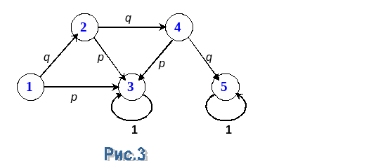 По таблице состояний строится граф, см. рис. 3. В узлах графа указаны состояния автомата. Над ребрами графа указаны вероятности перехода из состояния в состояние, причем принято, что попадание отметки в строб (появление "единицы" на входе автомата) происходит с вероятностью р , а отсутствие ее в стробе (появление "нуля" на входе автомата) - с вероятностью q.