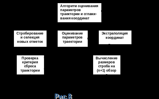 Сопровождение траекторий состоит в непрерывной привязке вновь получаемых в очередном обзоре отметок к соответствующим траекториям, сглаживании координат и оценивании параметров траектории движения цели. Структурная схема алгоритма сопровождения траектории представлена на рис.8.