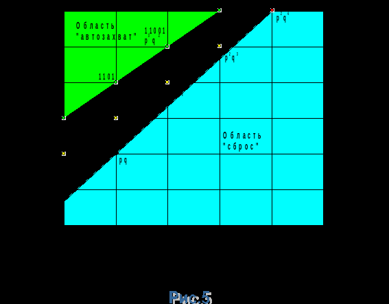 Движение изображающей точки начинается с момента появления двух единиц подряд, вероятность этого состояния р2. Стрелками указываются возможные направления перемещения изображающей точки, т.е. переходы из одного состояния в другое. Переходы в направлении вверх по вертикали происходят с вероятностью р, а по диагонали вправо и вверх - с вероятностью q. В предположении, что отдельные состояния независимы, вычисляются вероятности нахождения точки в каждом из состояний. Случайные блуждания этой точки происходят дискретно внутри области "неопределенность" до тех пор, пока точка не окажется либо на верхней пунктирной линии (состояние "автозахват"), либо на нижней (состояние "сброс"), после чего движение изображающей точки прекращается. Видно, что автозахват может произойти на третьем, на четвертом, на пятом и на шестом шаге, при этом оказываются вычисленными вероятности автозахвата на 3-м шаге (цикле обзора)
