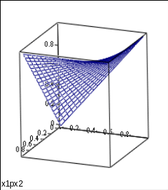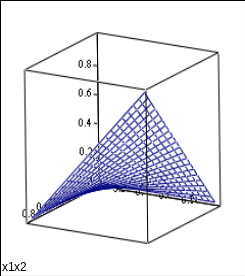 Рассмотрим геометрический смысл обычной t-нормы. Из аксиом Т1 и Т2 следует, что область определения x1x2, т.е. соответствующие значения, находятся на сторонах единичного куба в плоскости (x1,x2). Другими словами из аксиомы Т1 следует, что на стороне x2-1 единичного куба образуется линия x1x2=x1, на стороне x2=0 - линия в плоскости x1x2=0.