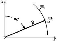 Поверхность ПП1 – сфера с радиусом R, ПП2 – вертикальная плоскость, составляющая с плоскостью северного меридиана ПСМ угол α, а ПП3 – горизонтальная плоскость, находящаяся на высоте Н от плоскости XOZ. Задача определения положения объекта существенно упрощается, если Н<<R, а поверхность Земли принимается за плоскость (при R≤500км замена части окружности, получающейся при сечении земного шара плоскостью, проходящей через центр Земли, прямой линией приводит к ошибке менее 0,2 % от R). В этом случае для определения положения объекта на плоскости используются линии положения (ЛП), представляющие собой геометрическое место точек на плоскости, имеющих одинаковые значения W. Местоположение объекта определяется как точка пересечения двух линий положения (рис.1.3,б): ЛП1 (W1=R=const) и ЛП2(W2=α=const). Линия ЛП1 – окружность с радиусом R, а ЛП2 – прямая, расположенная под углом α к оси Х, совпадающей с направлением северного меридиана. В рассматриваемой ситуации ЛП образуются при пересечении поверхностей положения ПП1 и ПП2 плоскостью XOZ. В позиционных РНС измеряют элементы W, характеризующие положение ЛА относительно стационарных или подвижных опорных передающих или приемопередающих радиостанций, расположенных в пунктах (РНТ) – радионавигационных точках с известными координатами(или на известных траекториях). Большинство РНС реализуют позиционный метод, что объясняется возможностью определения местоположения без учета и знания пройденного пути. Однако это возможно только в зоне действия опорных станций. Кроме того, на точность позиционных РНС сильно влияют помехи, отраженные сигналы и т.п. Точность позиционных систем зависит от принципа их построения и от используемого диапазона радиоволн и характеризуется погрешностью от нескольких сотен метров (в системах УКВ диапазона) до нескольких километров в РНС большой дальности, работающих в диапазонах километровых и мириаметровых волн. Навигационные элементы W, измеряемые в позиционных РНС, относятся к набору из 6 величин, измерение которых можно выполнить радиотехническими методами: 1) дальность, в том числе, псевдодальность, 2) разность дальностей до двух источников сигнала, 3) сумма дальностей, 4) пеленг, 5) обратный пеленг, 6) разность пеленгов. Линиями положения для перечисленных величин являются соответственно: 1) окружность, 2) гипербола, 3) эллипс, 4) луч из точки расположения потребителя, 5) луч из точки расположения маяка, 6) дуга окружности.