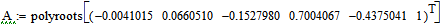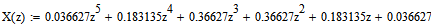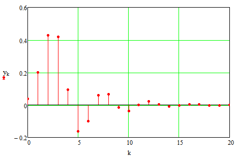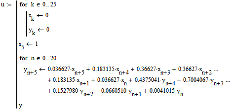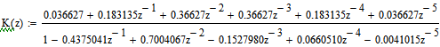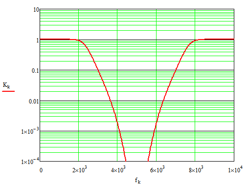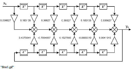 Заданная передаточная функция описывает рекурсивный фильтр нижних частот 5-го порядка с максимально плоской АЧХ в полосе пропускания и полосе задерживания (фильтр Баттерворта). Граничная частота полосы пропускания на уровне 0,9 (-1 дБ) равна 2 кГц. Граничные частоты полосы задерживания по уровню 0,1 (-20 дБ) равны 3 кГц и 7 кГц.