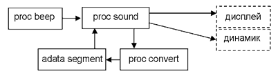 6. Изучите исходный код подпрограмм файла «playsnd.asm». Перенесите в сокращенный вариант процедуры sound этого модуля параметры, определяющие частоту системного генератора и длительность звучания сигнала 0.01 с, найденные при запуске предыдущей программы.