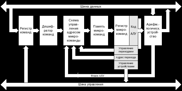 Процесс выполнения очередной команды, записанной в ОЗУ программ (на рисунке не показано), начинается с записи ее кода в регистр команд процессора. Дешифратор команд преобразует код команды в адрес первой микрокоманды, с которой начинается выполнения этой команды. Схема управления адресом выдает адрес первой микрокоманды на адресный вход ПЗУ микрокоманд (управляющей памяти). Считанная из памяти микрокоманда записывается в регистр микрокоманд. Одна группа разрядов микрокоманды поступает на АЛУ, указывая ему тип выполняемой микрооперации и адреса, участвующих в ней операндов. Другая группа разрядов поступает на схему управления адресом микрокоманды, сообщая адрес следующей микрокоманды в ПЗУ микрокоманд и условие перехода на этот адрес. Остальные разряды микрокоманды управляют устройствами ввода-вывода и процессом выборки команд и операндов из ОЗУ программ.
