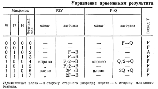 АЛУ выполняет требуемую микрооперацию, помещает результат по адресу, указанному в микрокоманде, и передает признаки (флаги), зависящие от результата, схеме управления адресом. Схема управления с учетом значения флагов формирует адрес очередной микрокоманды в цепочке микрокоманд и снова выдает его на вход ПЗУ. Этот процесс продолжается до тех пор, пока по признаку, содержащемуся в последней микрокоманде цепочки, схема управления не перейдет к выполнению новой команды из ОЗУ программ. Код новой команды к этому времени оказывается снова записанным в регистр команд.