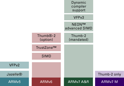 Во-вторых, эволюцию ARM-архитектуры можно рассматривать как эволюцию системы команд. К настоящему времени можно указать следующие этапы эволюции архитектуры системы команд: ARMv4, ARMv4T, ARMv5T, ARMv5TEJ, ARMv6, ARMv7.