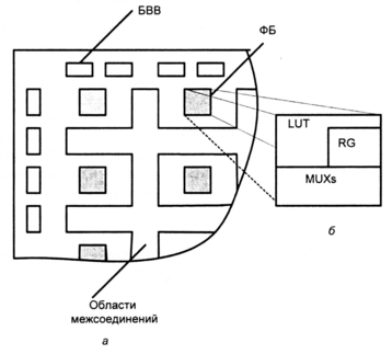 ис. 1.12. Фрагмент типичной FPGA (а) и структура ее функционального блока (б)