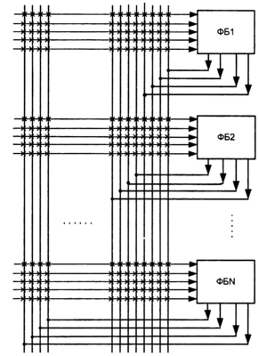 В программируемой матрице соединений ПМС (рис. 1.7) выходы функциональных блоков ФБ подключаются к вертикальным непрерывным (не сегментированным) линиям, причем каждому выходу соответствует своя линия. Входы ФБ связаны с горизонтальными линиями, пересекающими все вертикальные. На пересечениях горизонтальных и вертикальных линий имеются программируемые точки связи (показаны крестиками), так что любой вход ФБ может быть подключен к любому выходу, чем обеспечивается полная коммутируемость блоков.