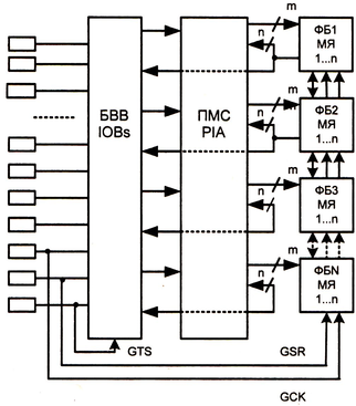В структурной схеме через ФБ обозначены функциональные блоки, число которых N зависит от логической сложности микросхемы. В каждом ФБ имеется п макроячеек МЯ (МС, Macrocells). Функциональные блоки получают т входных сигналов от программируемой матрицы соединений ПМС (PIA, Programmable Interconnect Апау). Выходные сигналы ФБ поступают как в ПМС, так и в блоки ввода/вывода БВВ (IOBs, Input/Output Blocks).