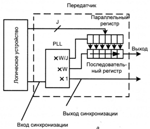 Параллельные данные от логического устройства с разрядностью J защелкиваются в регистре блока Serialize низкочастотным синхросигналом. Формируемые внутри блока высокочастотные синхросигналы выдвигают данные на выход блока. Блок PLL имеет два параметра (W и J), устанавливаемые по выбору проектировщика. Установка коэффициента умножения частоты W определяет соотношение между частотой системного тактирования и скоростью передачи в последовательной линии. Установка коэффициента J управляет шириной шины данных, вводимых в передатчик блока. Параметры W и J устанавливаются независимо друг от друга.