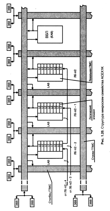 На рис. 1.20 приведена структура микросхем популярного семейства АСЕX1K архитектурно подобного семейству FLEXI0K. Микросхемы АСЕХIК являются хорошей иллюстрацией комбинирования архитектурных признаков FРGА и СРLD.