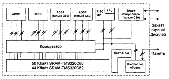 Архитектура процессора TMS320C80 относится к классу MIMD - множественный поток данных, множественный поток команд. Входящие в состав TMS320C80 процессоры программируются независимо один от другого и могут выполнять как разные, так и одну общую задачу. Обмен данными между процессорами осуществляется через общую внутрикристальную память, доступ к которой обеспечивает матричный коммутатор (Crossbar), выполняющий также функции монитора при одновременном обращении к одному сегменту памяти нескольких процессоров.
