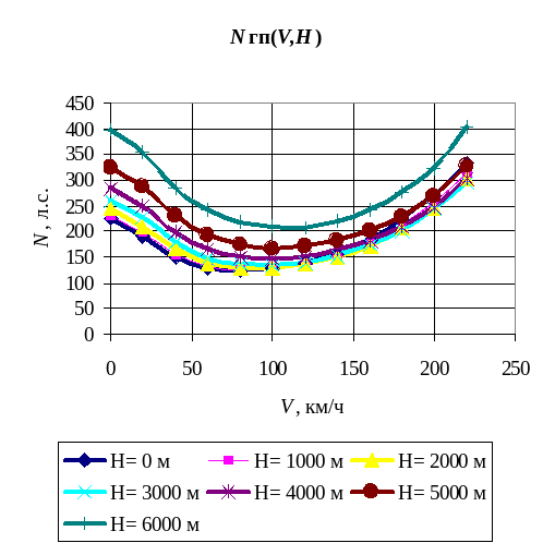 | Рис. 4.12. Зависимость изменения потребной мощности по высоте и скорости полета вертолета. |