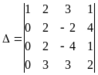 Из второй строки вычтем первую, умноженную на 2; из третьей вычтем первую, умноженную на 3; из четвертой вычтем первую.