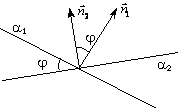 | Даны уравнения двух прямых. Требуется найти угол между ними. Угол между двумя непараллельными прямыми α1 и α2 найдем как угол между направляющими векторами этих прямых при задании канонических уравнений для α1 и α2, или же как угол между их нормалями, если заданы общие уравнения прямых α1 и α2. |