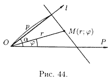 айдем уравнение прямой в полярных координатах. Ее положение можно определить, указав расстояние ρ от полюса О до данной прямой и угол α между полярной осью ОΡ и осью l, проходящей через полюс О перпендикулярно данной прямой (см. рис. 44).
