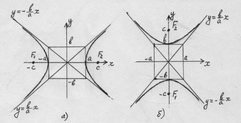 Построение графика этой гиперболы осуществляется в соответствии с изложенным выше порядком действий: строим вспомогательный прямоугольник, проводим асимптоты гиперболы, рисуем ветви гиперболы (см. рис.2.б).