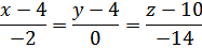 (x-4)((-4) • (-6)-4 • (-8)) - (y-4)(0 • (-6)-(-2) • (-8)) + (z-10)(0 • 4-(-2) • (-4)) = 56x + 16y - 8z-208 = 0