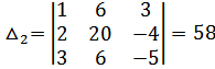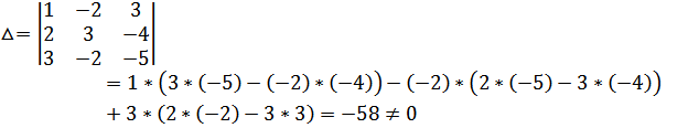 ∆=1•(3•(-5)-(-2•(-4)))-2•(-2•(-5)-(-2•3))+3•(-2•(-4)-3•3)=-58
