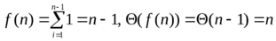 Обозначим через f(n) количество выполняемых в алгоритме операций сравнения и попытаемся вывести формулу, выражающую их зависимость от размера входных данных n. Известно, что за один цикл в алгоритме выполняется одна операция сравнения. Этот процесс повторяется для каждого значения счетчика цикла i, которое изменяется от 1 до n – 1 включительно. Поэтому для f(n) получаем следующую сумму: