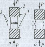 а- исходное состояние; б- после сварки; 1 - свариваемые заготовки; 2 - инструмент для передачи давления (пуансоны); 3 - нагреватель (индуктор)