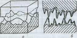 Рис. 1.3. Модель контакта твёрдых тел по макроскопической волнистости (а) и микроскопической шероховатости (6) поверхностей