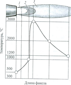 ис. 2.10. строение нормального газового пламени и распределение температуры по его длине