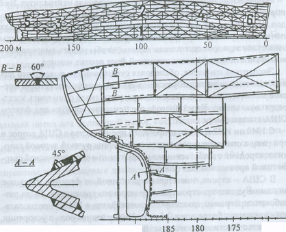 Для сокращения времени и уменьшения стоимости изготовления, снижения остаточных напряжений и деформаций разработали схему «расчленения» корпуса на секции (рис. 2.14). Каждую секцию сваривали из отдельных листов и элементов набора, что позволяло изготавливать судно на поточной линии одновременно на нескольких участках в цехе. Для сварки листов обшивки, толщина которых достигала 20 мм, применяли дуговую автоматическую сварку под слоем флюса; для уменьшения деформаций - многослойную обратно-ступенчатую сварку.