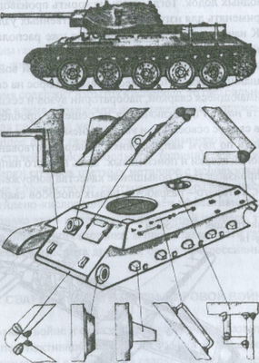 Одним из основных видов вооружения во Второй мировой войне были танки. С точки зрения технолога-изготовителя танк - сложное инженерное сооружение, состоящее из корпуса и башни (рис. 2.13). Корпус танка собирают из катаных броневых плит толщиной от 45 до 120 мм. Эти плиты необходимо соединить в прочную конструкцию. Поэтому инженеру-сварщику приходится рассматривать танк как сооружение, изготавливаемое не только путём получения угловых и стыковых соединений в различных пространственных положениях, но и как сооружение, изготавливаемое из трудно-свариваемого материала.