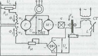 В этой системе происходит сравнение напряжения дуги Uд с заданным напряжением U3 путём сопоставления магнитных потоков Ф1 и Ф2 в обмотках цепи возбуждения w1 и w2 генератора Г. Скорость подачи проволоки Vп определяется напряжением на якоре двигателя М, питаемого от генератора Г Напряжение, вырабатываемое генератором, зависит от разности магнитных потоков Ф1 и Ф2. Поток Ф1 пропорционален Uд; при повышении напряжения на дуге увеличивается Ф2, напряжение, вырабатываемое генератором и, соответственно, скорость подачи проволоки Vп.