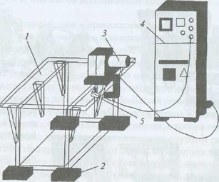 Эффективным и недорогим является вибрационный метод снижения остаточных напряжений. Виброобработке подвергают металлоконструкции из углеродистых сталей, чугунов, алюминиевых и титановых сплавов. Сущность метода заключается в том, что металлоконструкция 1 (рис. 4.30) установлена на виброизолирующих опорах 2. К ней прикреплен струбцинами или болтами вибровозбуди тель 3 с регулируемой частотой колебаний. На пульте управления виброустановки 4 расположены приборы, регистрирующие частоту и амплитуду колебаний с помощью датчика 5, прикрепленного к сварной конструкции. При плавном изменении частоты колебаний от минимальной до максимальной регистрируют резонансные частоты системы «сварная конструкция — вибровозбудитель». Затем производят виброобработку на выбранных резонансных частотах.
