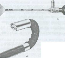 а - оптическая система эндоскопа; б - общий вид эндоскопа с гибким световодом (флексоскопа); в - головка флексоскопа; г - диагностирование авиационного двигателя