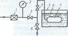 Рис. 4.34. Схема контроля пузырьковым методом: 1 - редакционный клапан; 2 - манометр; 3 - клапан; 4 - предохранительный клапан; 5 - бак; 6 - жидкость; 7-контролируемое изделие; 8 - вентиль сброса давления