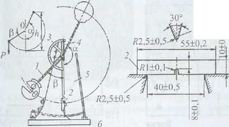 Рис. 4.56. Общий вид (а) и схема (б) маятникового копра и схема испытания на ударный изгиб образца с концентратором (в): I - маятник; 2 - образец; 3 - шкала; 4 - стрелка шкалы; 5 - тормоз