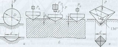 вёрдость по Виккерсу (HV) заключается во вдавливании алмазного наконечника, имеющего форму правильной четырёхгранной пирамиды, в образец (изделие) под действием нагрузки Р и измерении диагонали отпечатка d, оставшегося после снятия нагрузки (рис. 4,54, в).